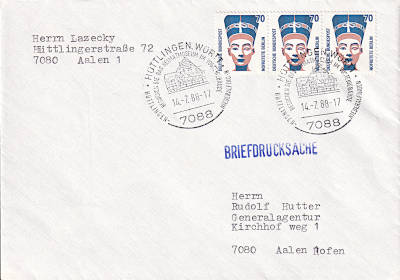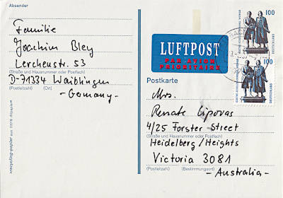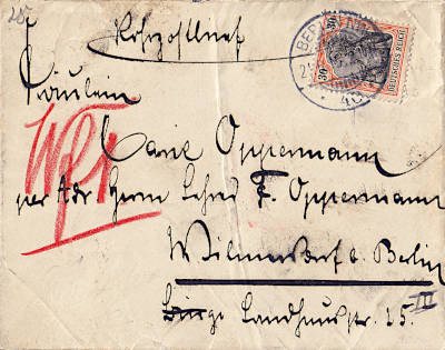 Hinweisvermerk Postlagernd: Vermerk der auf eine gebührenfreie Zusatzleistung hinweist bei der eine Postsendung nicht zu-gestellt sondern vom Empfäger am Schalter einer Postfiliale abgeholt wird (in Deutsch-land bis 31.11.1923 gebührenpflichtig) |