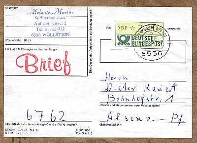 Hinweisvermerk Postkarte: Vermerk der auf eine offene Grundsendung für den Ver-sand von kurzen Mitteilungen hinweist |