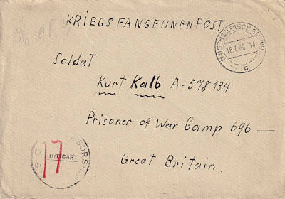 Hinweisvermerk Kriegsgefangenenpost: Vermerk der auf eine gebührenfreie Post-sendung zwischen einem Kriegsgefangenen und dessen Angehörigen hinweist |