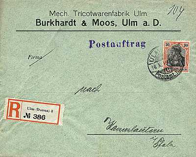 Hinweisvermerk Wertangabe: Vermerk der auf eine Zusatzleistung hinweist bei der dem Absender die Einlieferung bescheinigt wird und der Empfänger den Erhalt der Post-sendung unterschriftlich bestätigen muss. Bei Verlust haftet die Post in tatsächlicher Höhe bis zum angegebenen Wert (in Deutsch-land bis 30.09.1919 Sonderleistung) |