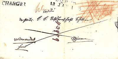 Chargé-Gitter: handschriftlicher gitterför-miger Hinweisvermerk der auf die Zusatz-leistung Einschreiben hinweist (Rötelgitter) |