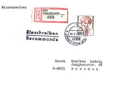 Postsendung mit Hinweisstempel, Hinweis-klebezettel und maschinengeschriebenem Hinweisvermerk Einschreiben |