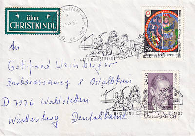 Leitvermerk Christkindl: Vorausverfügung eines Absenders mit dem er die Post aufford-ert seine Postsendung zwecks Erlangung des Sonderstempels über die Gemeinde Christ-kindl bei Steyr zu leiten |