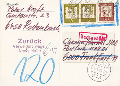 Hinweisvermerk Nachgebühr: Vermerk auf einer unzureichend freigemachten Post-sendung bei der die fehlende Beförderungs-gebühr vom Empfänger bezahlt werden sollte |