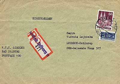 01.09.1948 - 30.06.1954: Inland cover with registeration (1-20 g) franked with 60 Pfennig (=20 cover 40 registeration)