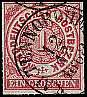 farbiger Durchstich: Briefmarke mit einem Liniendurchstich bei dem die Trenneisen die Farbwalze berührt haben und deshalb mit-gedruckt wurden
