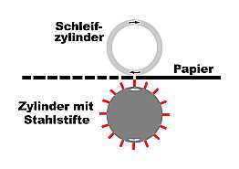 Schleifperforation: das Papier wird mit Stifte an eine schnell rotierende Walze ge-drückt so dass runde Löcher aus dem Papier geschliffen werden |