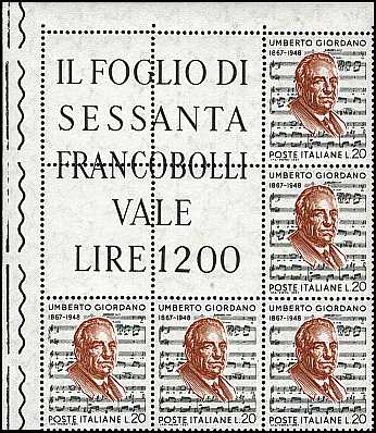Block of nine with 5 postage stamps and 4 printed labels with the sheet value price